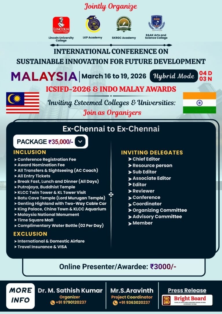 The International Conference on Sustainable Innovation for Future Development (ICSIED–2026) & Indo–Malay Awards is a joint academic initiative by Lincoln University College (Malaysia), LKP Academy, SKRGC Academy, and RAAK Arts and Science College, aimed at bringing together academicians, researchers, industry professionals, and policymakers to promote innovative solutions for sustainable global development. The conference fosters international collaboration between India and Malaysia through keynote sessions, research presentations, panel discussions, and academic networking, while also recognizing excellence in education and research through the Indo–Malay Awards, thereby creating a dynamic platform for knowledge exchange, institutional partnerships, and future-focused innovation.