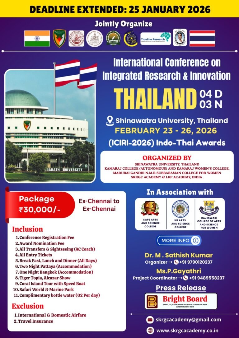 The International Conference on Integrated Research & Innovation – 2026 is a prestigious academic event jointly organized by Shinawatra University, Thailand, and leading institutions from India. Scheduled from February 23–26, 2026, the conference brings together scholars, researchers, and professionals to explore interdisciplinary themes across arts, science, engineering, medical sciences, social sciences, languages, and management. The event emphasizes innovation, collaboration, and global problem-solving. Alongside the conference, Educational Multidisciplinary International Awards will honor outstanding educators, researchers, entrepreneurs, and professionals for their impactful contributions, celebrating excellence, creativity, and leadership across diverse domains.